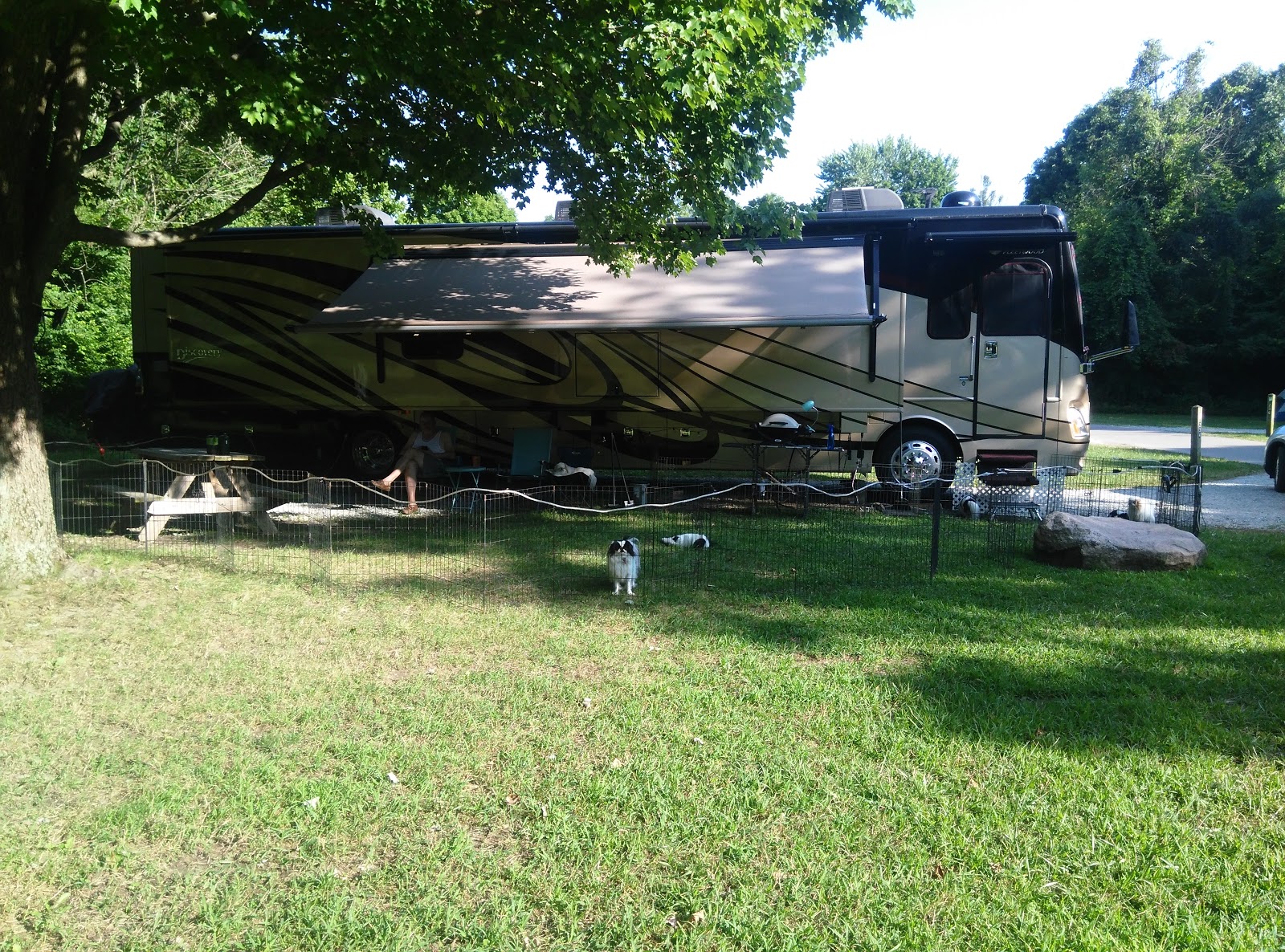 Our site is very large. It has a gravel parking pad and nice grass. There is a large tree that provides some shade. Afternoon shade is provided by the motorhome and awning. The parking pad is not quite level. We had to put 2 boards under the front tires to get level. Even with the boards, the front end is quite high. We used all 7 xpens, and there is still quite a bit of space between the pens and our neighbor's site. There is a water spigot right next to our site, so filling our fresh water tank is not a problem. But, the dump station is just short of a mile away, so pulling the portable tote there will take quite a while.